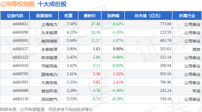 证券之星消息,10月28日,公用等权(000079)指数报收于2657.72点,跌0.59%,成交165.28亿元,换手率0.84%。当日该指数成份股中,上涨的有6家,大唐发电以2.41%的涨幅领涨,下跌的有23家,九丰能源以5.33%的跌幅领跌。