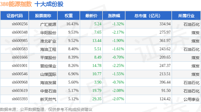 380能源(000104)指数十大成份股详情如下: