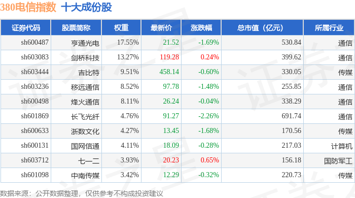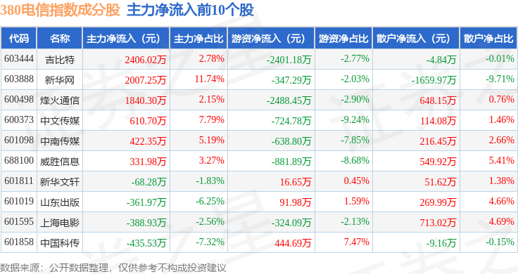资金流向方面,380电信(000112)指数成份股当日主力资金净流出合计6.28亿元,游资资金净流入合计2.24亿元,散户资金净流入合计4.04亿元。成份股资金流向详情见下表: