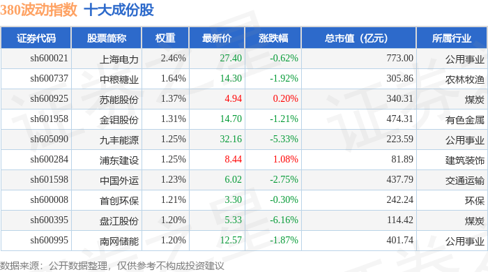 证券之星消息,10月28日,380波动(000130)指数报收于13479.84点,跌0.67%,成交328.98亿元,换手率1.21%。当日该指数成份股中,上涨的有19家,厦门银行以5.46%的涨幅领涨,下跌的有76家,盘江股份以6.16%的跌幅领跌。