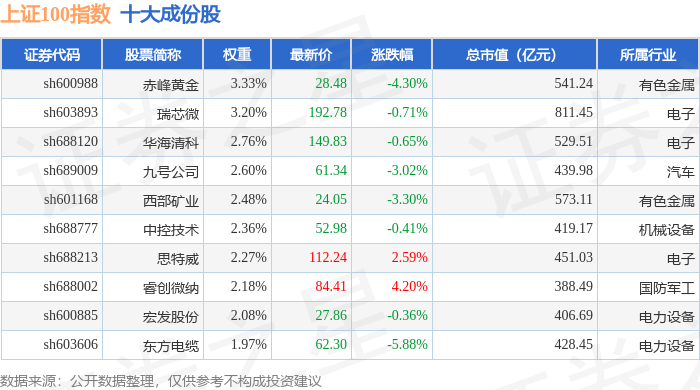 证券之星消息,10月28日,上证100(000132)指数报收于6000.16点,跌0.81%,成交458.62亿元,换手率1.56%。当日该指数成份股中,上涨的有30家,海兴电力以9.99%的涨幅领涨,下跌的有69家,南微医学以6.3%的跌幅领跌。