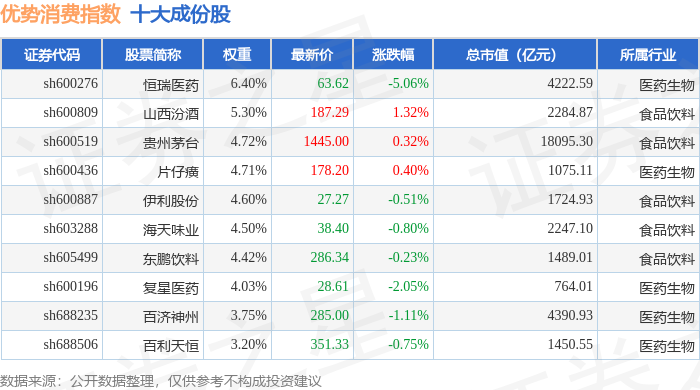 证券之星消息,10月28日,优势消费(000147)指数报收于7028.59点,跌0.71%,成交249.83亿元,换手率0.94%。当日该指数成份股中,上涨的有7家,万泰生物以2.4%的涨幅领涨,下跌的有36家,恒瑞医药以5.06%的跌幅领跌。