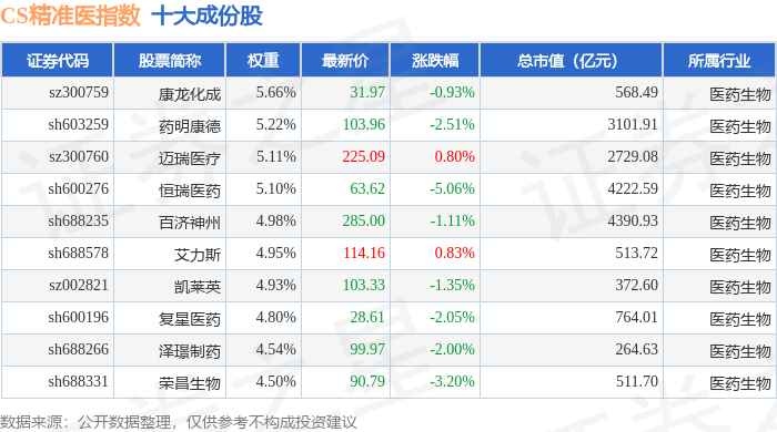 证券之星消息,10月28日,CS精准医(000863)指数报收于2859.13点,跌1.11%,成交227.63亿元,换手率1.52%。当日该指数成份股中,上涨的有11家,三生国健以7.48%的涨幅领涨,下跌的有27家,贝达药业以5.12%的跌幅领跌。