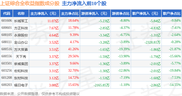 资金流向方面,上证综合全收益(000888)指数成份股当日主力资金净流出合计302.45亿元,游资资金净流入合计92.47亿元,散户资金净流入合计209.98亿元。成份股资金流向详情见下表: