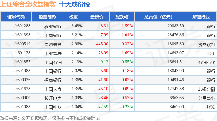 上证综合全收益(000888)指数十大成份股详情如下: