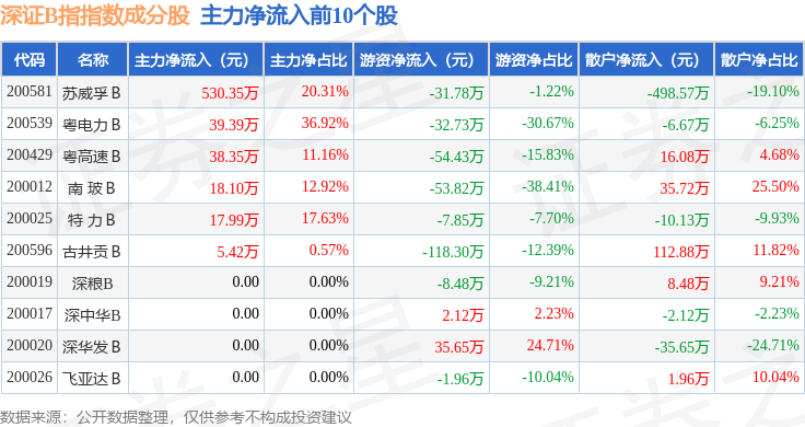 资金流向方面,深证B指(399108)指数成份股当日主力资金净流出合计332.81万元,游资资金净流出合计149.32万元,散户资金净流入合计482.12万元。成份股资金流向详情见下表: