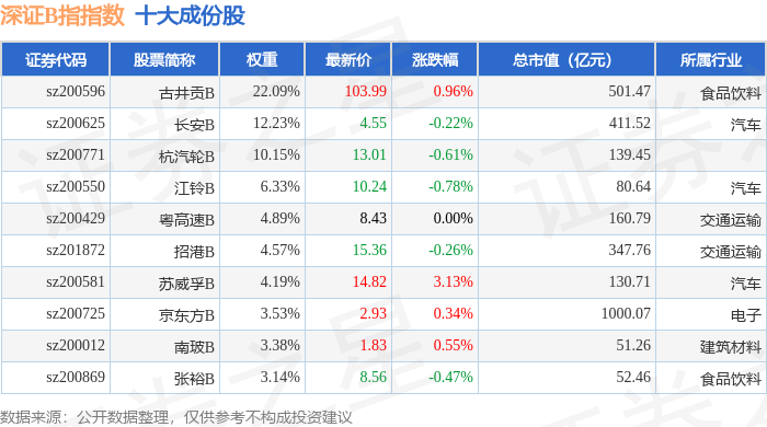 深证B指(399108)指数十大成份股详情如下: