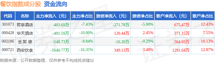 资金流向方面,餐饮指数(399238)成份股当日主力资金净流出合计3084.78万元,游资资金净流入合计181.58万元,散户资金净流入合计2903.2万元。成份股资金流向详情见下表: