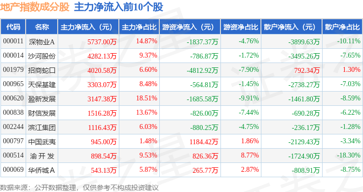 资金流向方面,地产指数(399241)成份股当日主力资金净流出合计3.64亿元,游资资金净流出合计1245.03万元,散户资金净流入合计3.77亿元。成份股资金流向详情见下表: