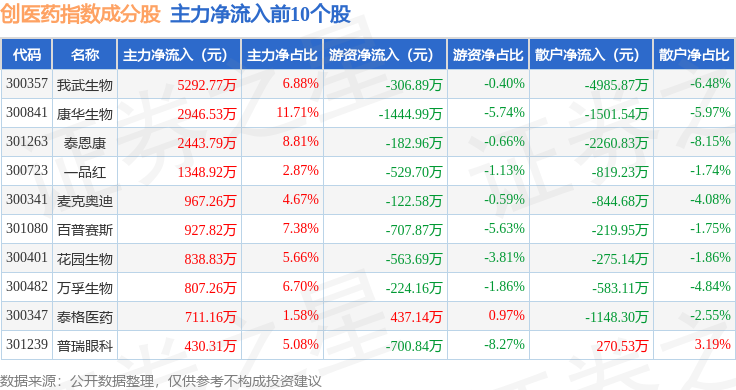 资金流向方面,创医药(399275)指数成份股当日主力资金净流出合计9.05亿元,游资资金净流入合计1.97亿元,散户资金净流入合计7.07亿元。成份股资金流向详情见下表: