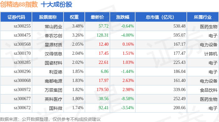 证券之星消息,10月28日,创精选88(399291)指数报收于4365.8点,跌0.21%,成交481.84亿元,换手率3.01%。当日该指数成份股中,上涨的有41家,东富龙以8.88%的涨幅领涨,下跌的有45家,英科医疗以8.58%的跌幅领跌。
