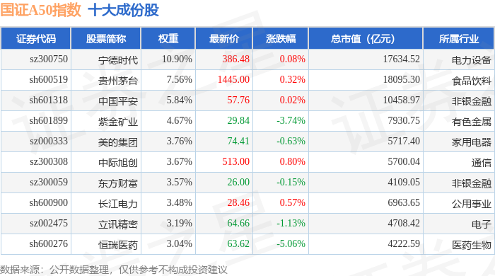 资金流向方面,国证A50(399310)指数成份股当日主力资金净流出合计72.99亿元,游资资金净流入合计43.28亿元,散户资金净流入合计29.71亿元。成份股资金流向详情见下表: