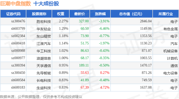 证券之星消息,10月28日,巨潮中盘(399315)指数报收于4690.01点,跌0.9%,成交3370.71亿元,换手率1.67%。当日该指数成份股中,上涨的有90家,福莱特以7.96%的涨幅领涨,下跌的有205家,铜陵有色以10.07%的跌幅领跌。