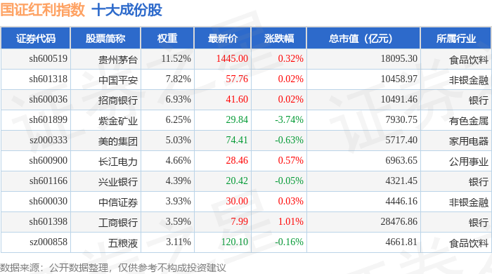 证券之星消息,10月28日,国证红利(399321)指数报收于7700.33点,跌0.48%,成交734.73亿元,换手率0.31%。当日该指数成份股中,上涨的有11家,农业银行以1.59%的涨幅领涨,下跌的有37家,浦发银行以4.47%的跌幅领跌。