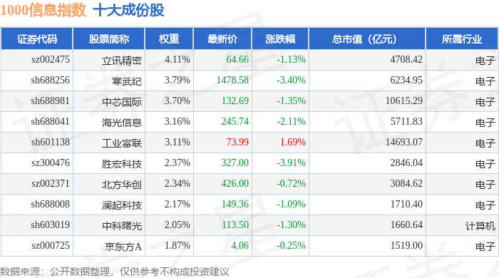 证券之星消息,10月28日,1000信息(399388)指数报收于6820.53点,跌0.33%,成交3840.71亿元,换手率2.47%。当日该指数成份股中,上涨的有76家,景旺电子以10.0%的涨幅领涨,下跌的有104家,华丰科技以9.17%的跌幅领跌。