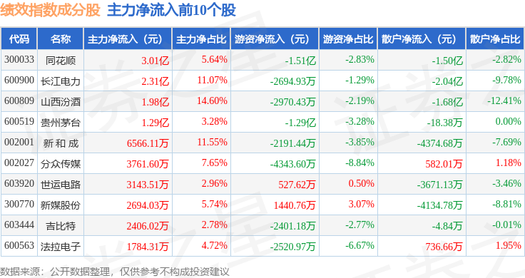 资金流向方面,绩效指数(399398)成份股当日主力资金净流出合计20.78亿元,游资资金净流入合计7.76亿元,散户资金净流入合计13.01亿元。成份股资金流向详情见下表: