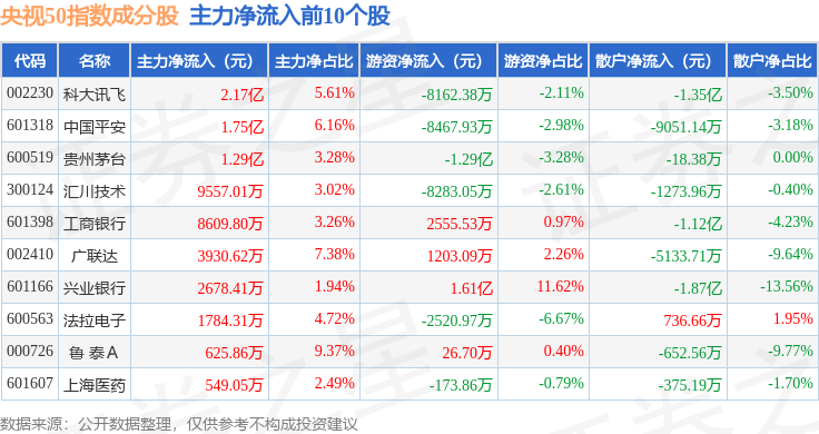 资金流向方面,央视50(399550)指数成份股当日主力资金净流出合计37.84亿元,游资资金净流入合计19.88亿元,散户资金净流入合计17.95亿元。成份股资金流向详情见下表: