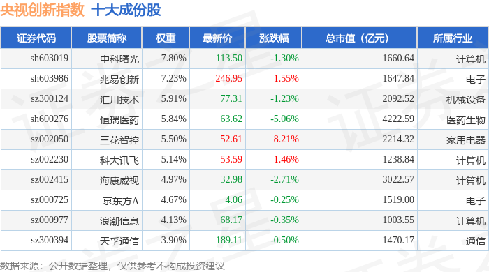 证券之星消息,10月28日,央视创新(399551)指数报收于10735.62点,跌0.38%,成交1007.74亿元,换手率2.17%。当日该指数成份股中,上涨的有16家,三花智控以8.21%的涨幅领涨,下跌的有32家,贝达药业以5.12%的跌幅领跌。