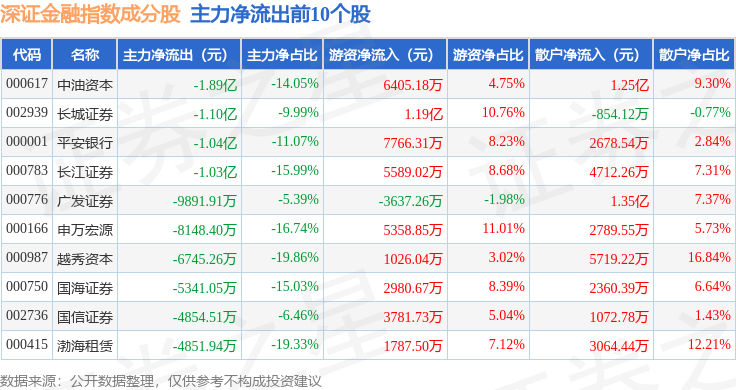 资金流向方面,深证金融(399619)指数成份股当日主力资金净流出合计10.9亿元,游资资金净流入合计6.81亿元,散户资金净流入合计4.1亿元。成份股资金流向详情见下表: