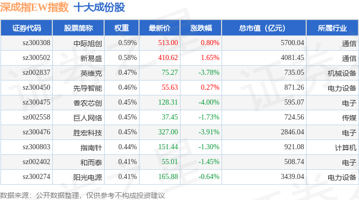 证券之星消息,10月28日,深成指EW(399659)指数报收于4610.72点,跌0.46%,成交6104.91亿元,换手率1.9%。当日该指数成份股中,上涨的有162家,中钨高新以10.02%的涨幅领涨,下跌的有327家,铜陵有色以10.07%的跌幅领跌。
