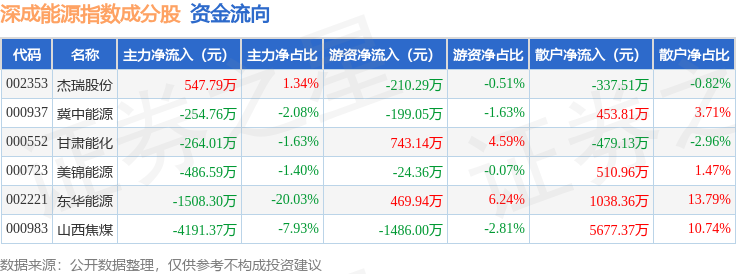 资金流向方面,深成能源(399680)指数成份股当日主力资金净流出合计6157.24万元,游资资金净流出合计706.62万元,散户资金净流入合计6863.86万元。成份股资金流向详情见下表: