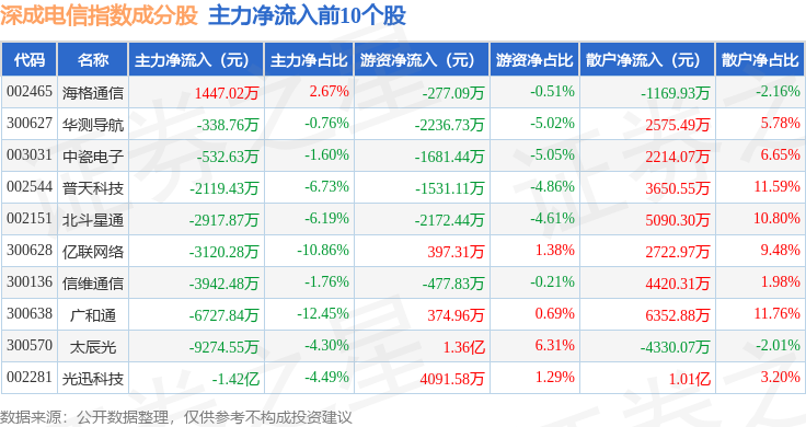 资金流向方面,深成电信(399688)指数成份股当日主力资金净流出合计32.92亿元,游资资金净流入合计19.99亿元,散户资金净流入合计12.93亿元。成份股资金流向详情见下表: