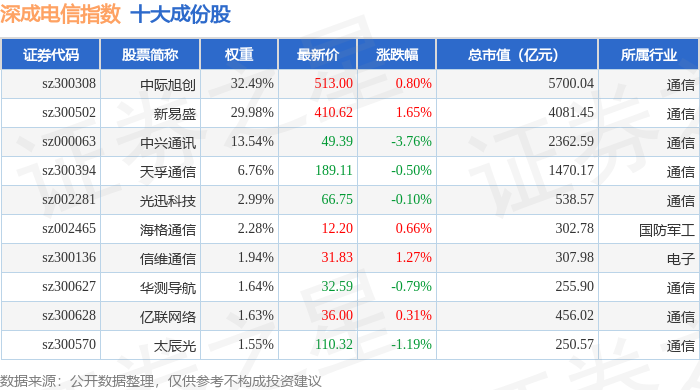 证券之星消息,10月28日,深成电信(399688)指数报收于6192.93点,涨0.24%,成交698.46亿元,换手率4.07%。当日该指数成份股中,上涨的有8家,中瓷电子以2.68%的涨幅领涨,下跌的有7家,中兴通讯以3.76%的跌幅领跌。