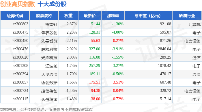 创业高贝(399694)指数十大成份股详情如下: