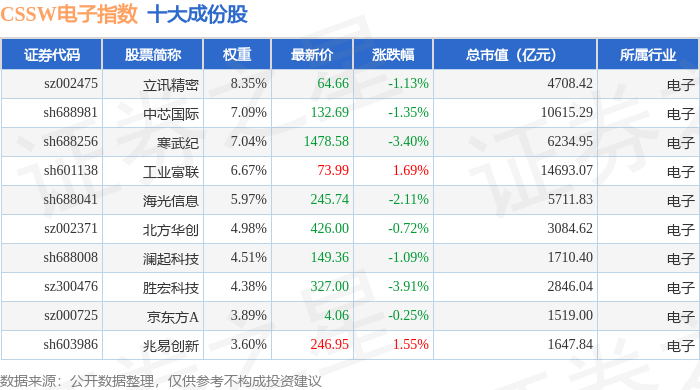 CSSW电子(399811)指数十大成份股详情如下: