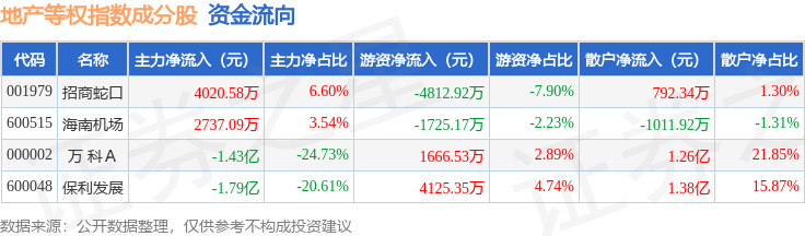 资金流向方面,地产等权(399983)指数成份股当日主力资金净流出合计2.55亿元,游资资金净流出合计746.2万元,散户资金净流入合计2.62亿元。成份股资金流向详情见下表: