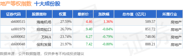 证券之星消息,10月28日,地产等权(399983)指数报收于2197.89点,跌0.16%,成交28.29亿元,换手率1.14%。当日该指数成份股中,上涨的有1家,海南机场以1.36%的涨幅领涨,下跌的有3家,招商蛇口以0.84%的跌幅领跌。