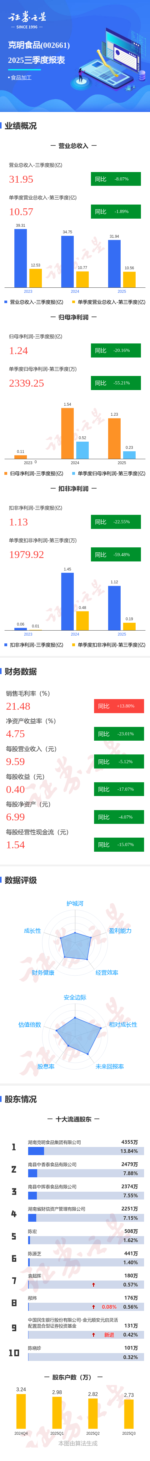 证券之星消息,克明食品2025年三季报显示,公司主营收入31.95亿元,同比下降8.07%;归母净利润1.24亿元,同比下降20.17%;扣非净利润1.13亿元,同比下降22.55%;其中2025年第三季度,公司单季度主营收入10.57亿元,同比下降1.89%;单季度归母净利润2339.25万元,同比下降55.21%;单季度扣非净利润1979.92万元,同比下降59.48%;负债率56.36%,投资收益296.27万元,财务费用5888.09万元,毛利率21.48%。