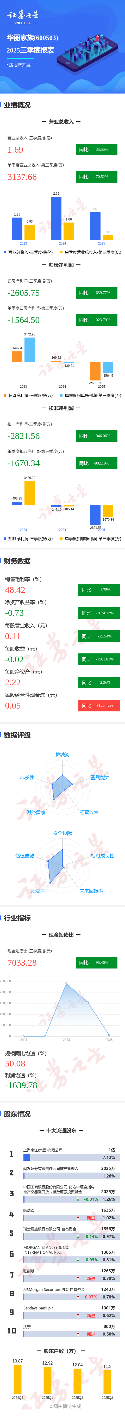 证券之星消息,华丽家族2025年三季报显示,公司主营收入1.69亿元,同比下降35.56%;归母净利润-2605.75万元,同比下降1639.78%;扣非净利润-2821.56万元,同比下降1046.06%;其中2025年第三季度,公司单季度主营收入3137.66万元,同比下降70.52%;单季度归母净利润-1564.5万元,同比下降1023.8%;单季度扣非净利润-1670.34万元,同比下降802.2%;负债率22.35%,投资收益11.35万元,财务费用-800.29万元,毛利率48.42%。
