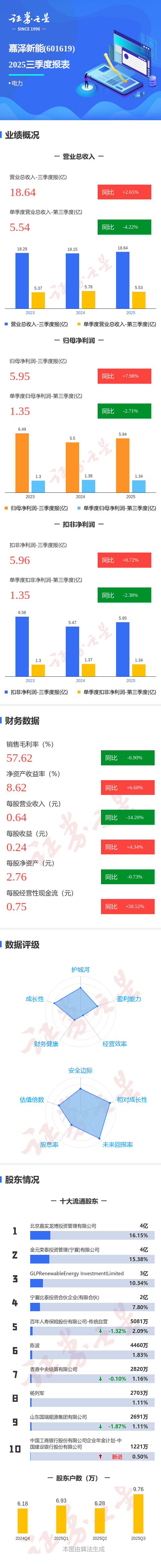 证券之星消息,嘉泽新能2025年三季报显示,公司主营收入18.64亿元,同比上升2.66%;归母净利润5.95亿元,同比上升7.99%;扣非净利润5.96亿元,同比上升8.73%;其中2025年第三季度,公司单季度主营收入5.54亿元,同比下降4.23%;单季度归母净利润1.35亿元,同比下降2.72%;单季度扣非净利润1.35亿元,同比下降2.38%;负债率66.53%,投资收益1327.2万元,财务费用3.53亿元,毛利率57.62%。