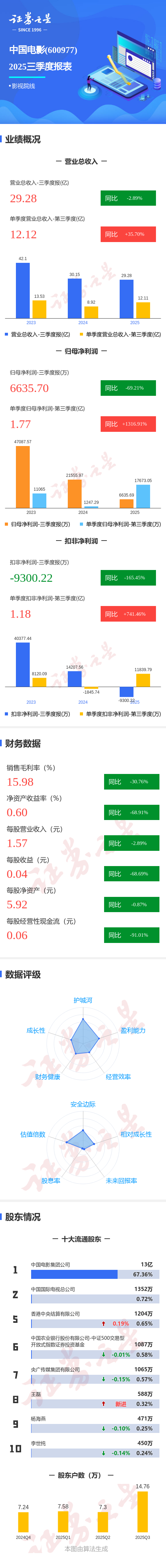 证券之星消息,中国电影2025年三季报显示,公司主营收入29.28亿元,同比下降2.9%;归母净利润6635.7万元,同比下降69.22%;扣非净利润-9300.22万元,同比下降165.46%;其中2025年第三季度,公司单季度主营收入12.12亿元,同比上升35.71%;单季度归母净利润1.77亿元,同比上升1316.91%;单季度扣非净利润1.18亿元,同比上升741.46%;负债率39.34%,投资收益1.13亿元,财务费用-5840.51万元,毛利率15.98%。
