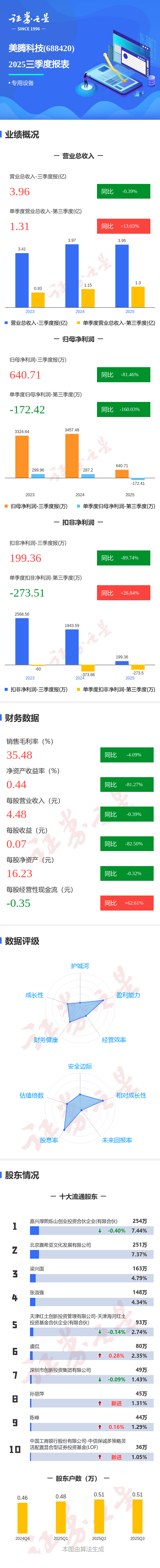 证券之星消息,美腾科技2025年三季报显示,公司主营收入3.96亿元,同比下降0.4%;归母净利润640.71万元,同比下降81.47%;扣非净利润199.36万元,同比下降89.74%;其中2025年第三季度,公司单季度主营收入1.31亿元,同比上升13.04%;单季度归母净利润-172.42万元,同比下降160.03%;单季度扣非净利润-273.51万元,同比上升26.84%;负债率23.82%,投资收益375.82万元,财务费用-220.61万元,毛利率35.48%。