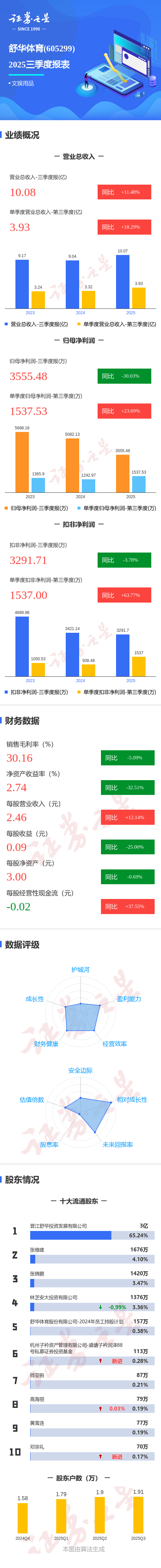 证券之星消息,舒华体育2025年三季报显示,公司主营收入10.08亿元,同比上升11.49%;归母净利润3555.48万元,同比下降30.04%;扣非净利润3291.71万元,同比下降3.78%;其中2025年第三季度,公司单季度主营收入3.93亿元,同比上升18.3%;单季度归母净利润1537.53万元,同比上升23.7%;单季度扣非净利润1537.0万元,同比上升63.78%;负债率38.12%,投资收益20.42万元,财务费用-352.55万元,毛利率30.16%。