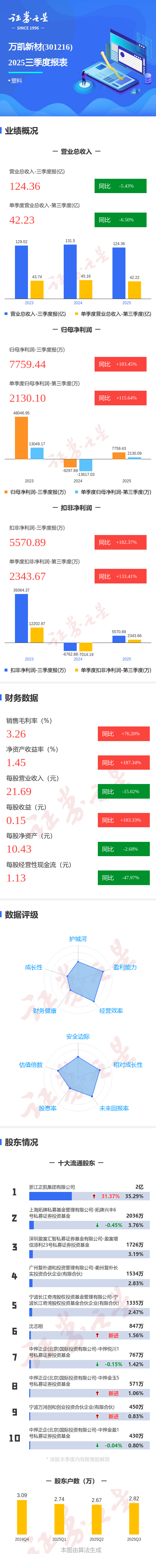 证券之星消息,万凯新材2025年三季报显示,公司主营收入124.36亿元,同比下降5.43%;归母净利润7759.44万元,同比上升183.45%;扣非净利润5570.89万元,同比上升182.37%;其中2025年第三季度,公司单季度主营收入42.23亿元,同比下降6.5%;单季度归母净利润2130.1万元,同比上升115.64%;单季度扣非净利润2343.67万元,同比上升133.41%;负债率65.62%,投资收益-6588.0万元,财务费用6423.55万元,毛利率3.26%。