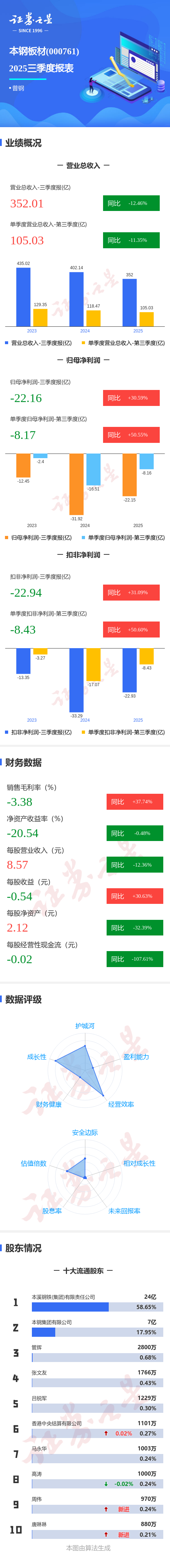 证券之星消息,本钢板材2025年三季报显示,公司主营收入352.01亿元,同比下降12.47%;归母净利润-22.16亿元,同比上升30.6%;扣非净利润-22.94亿元,同比上升31.1%;其中2025年第三季度,公司单季度主营收入105.03亿元,同比下降11.35%;单季度归母净利润-8.17亿元,同比上升50.56%;单季度扣非净利润-8.43亿元,同比上升50.6%;负债率78.0%,投资收益-2269.55万元,财务费用2.95亿元,毛利率-3.38%。