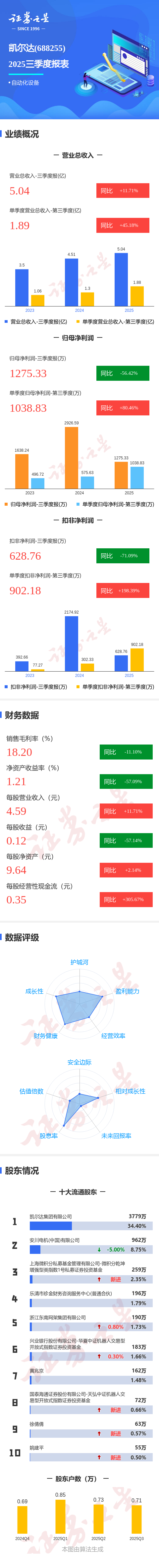 证券之星消息,凯尔达2025年三季报显示,公司主营收入5.04亿元,同比上升11.72%;归母净利润1275.33万元,同比下降56.42%;扣非净利润628.76万元,同比下降71.09%;其中2025年第三季度,公司单季度主营收入1.89亿元,同比上升45.19%;单季度归母净利润1038.83万元,同比上升80.47%;单季度扣非净利润902.18万元,同比上升198.4%;负债率15.15%,投资收益720.36万元,财务费用-199.02万元,毛利率18.2%。