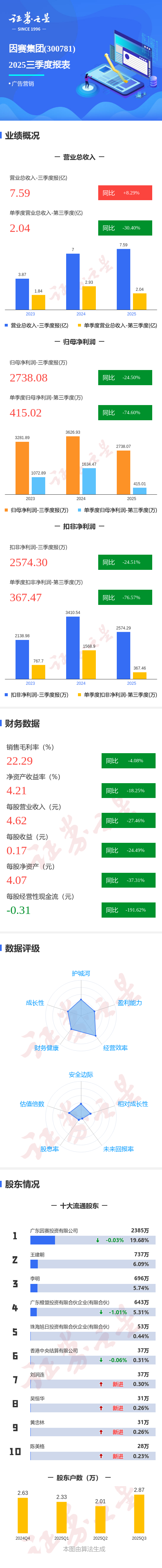 证券之星消息,因赛集团2025年三季报显示,公司主营收入7.59亿元,同比上升8.29%;归母净利润2738.08万元,同比下降24.51%;扣非净利润2574.3万元,同比下降24.52%;其中2025年第三季度,公司单季度主营收入2.04亿元,同比下降30.41%;单季度归母净利润415.02万元,同比下降74.61%;单季度扣非净利润367.47万元,同比下降76.58%;负债率25.56%,投资收益260.16万元,财务费用120.79万元,毛利率22.29%。