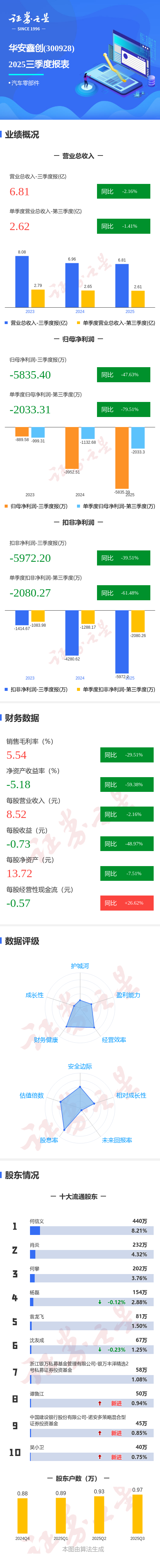 证券之星消息,华安鑫创2025年三季报显示,公司主营收入6.81亿元,同比下降2.16%;归母净利润-5835.4万元,同比下降47.64%;扣非净利润-5972.2万元,同比下降39.52%;其中2025年第三季度,公司单季度主营收入2.62亿元,同比下降1.42%;单季度归母净利润-2033.31万元,同比下降79.51%;单季度扣非净利润-2080.27万元,同比下降61.49%;负债率14.83%,投资收益-1116.98万元,财务费用99.27万元,毛利率5.54%。