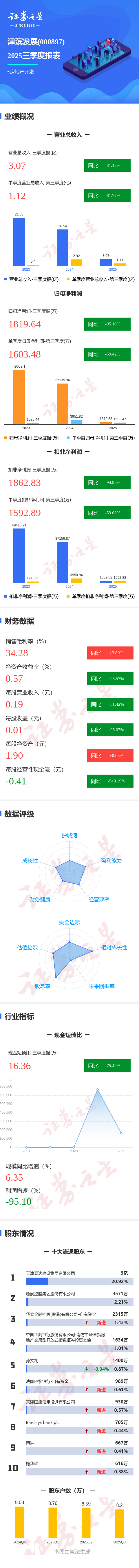 证券之星消息,津滨发展2025年三季报显示,公司主营收入3.07亿元,同比下降81.42%;归母净利润1819.64万元,同比下降95.1%;扣非净利润1862.83万元,同比下降94.99%;其中2025年第三季度,公司单季度主营收入1.12亿元,同比下降61.77%;单季度归母净利润1603.48万元,同比下降59.42%;单季度扣非净利润1592.89万元,同比下降59.68%;负债率29.31%,投资收益1416.45万元,财务费用-251.63万元,毛利率34.28%。
