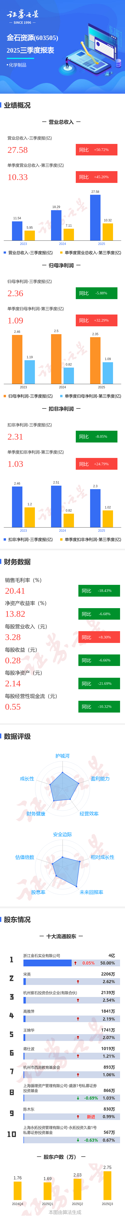 证券之星消息,金石资源2025年三季报显示,公司主营收入27.58亿元,同比上升50.73%;归母净利润2.36亿元,同比下降5.88%;扣非净利润2.31亿元,同比下降8.05%;其中2025年第三季度,公司单季度主营收入10.33亿元,同比上升45.21%;单季度归母净利润1.09亿元,同比上升32.29%;单季度扣非净利润1.03亿元,同比上升24.8%;负债率66.61%,投资收益8267.33万元,财务费用8831.73万元,毛利率20.41%。