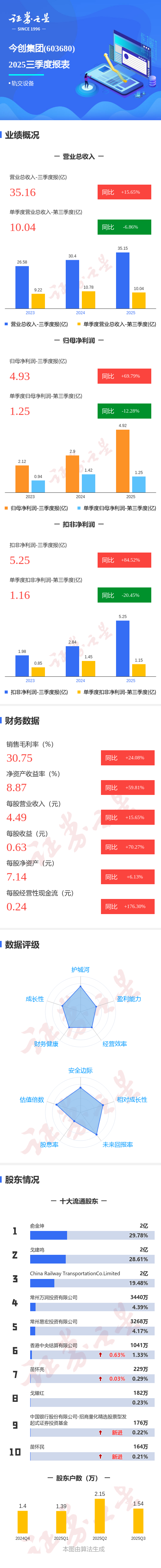 证券之星消息,今创集团2025年三季报显示,公司主营收入35.16亿元,同比上升15.66%;归母净利润4.93亿元,同比上升69.79%;扣非净利润5.25亿元,同比上升84.52%;其中2025年第三季度,公司单季度主营收入10.04亿元,同比下降6.86%;单季度归母净利润1.25亿元,同比下降12.29%;单季度扣非净利润1.16亿元,同比下降20.45%;负债率38.37%,投资收益6606.47万元,财务费用1240.96万元,毛利率30.75%。