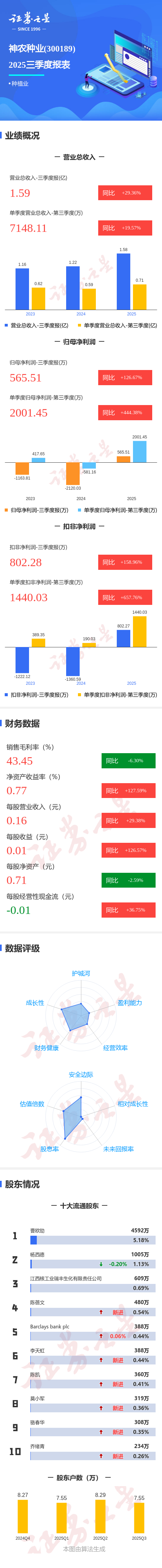 证券之星消息,神农种业2025年三季报显示,公司主营收入1.59亿元,同比上升29.36%;归母净利润565.51万元,同比上升126.67%;扣非净利润802.28万元,同比上升158.97%;其中2025年第三季度,公司单季度主营收入7148.11万元,同比上升19.57%;单季度归母净利润2001.45万元,同比上升444.39%;单季度扣非净利润1440.03万元,同比上升657.77%;负债率37.4%,投资收益1019.1万元,财务费用205.56万元,毛利率43.45%。