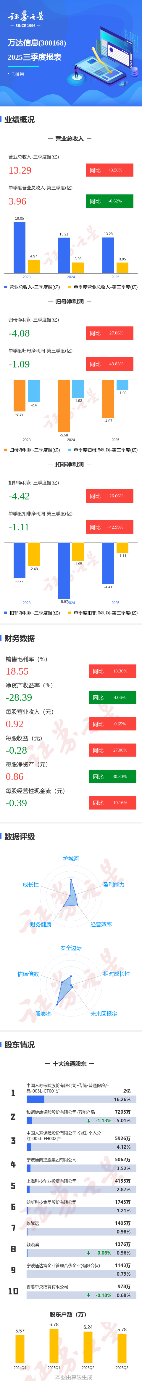 证券之星消息,万达信息2025年三季报显示,公司主营收入13.29亿元,同比上升0.57%;归母净利润-4.08亿元,同比上升27.07%;扣非净利润-4.42亿元,同比上升26.07%;其中2025年第三季度,公司单季度主营收入3.96亿元,同比下降0.63%;单季度归母净利润-1.09亿元,同比上升43.83%;单季度扣非净利润-1.11亿元,同比上升43.0%;负债率79.65%,投资收益1101.56万元,财务费用4288.5万元,毛利率18.55%。