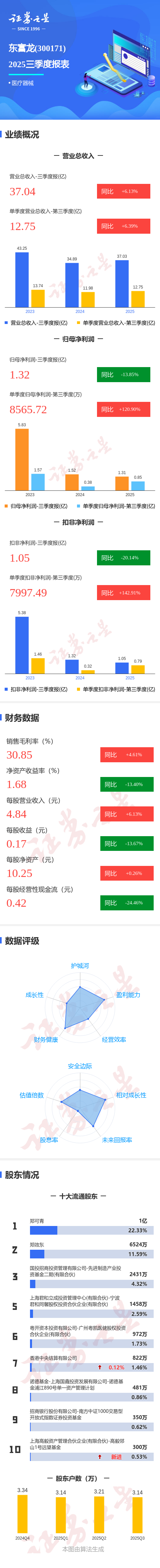证券之星消息,东富龙2025年三季报显示,公司主营收入37.04亿元,同比上升6.14%;归母净利润1.32亿元,同比下降13.86%;扣非净利润1.05亿元,同比下降20.15%;其中2025年第三季度,公司单季度主营收入12.75亿元,同比上升6.39%;单季度归母净利润8565.72万元,同比上升120.91%;单季度扣非净利润7997.49万元,同比上升142.91%;负债率39.19%,投资收益1218.18万元,财务费用-2608.96万元,毛利率30.85%。