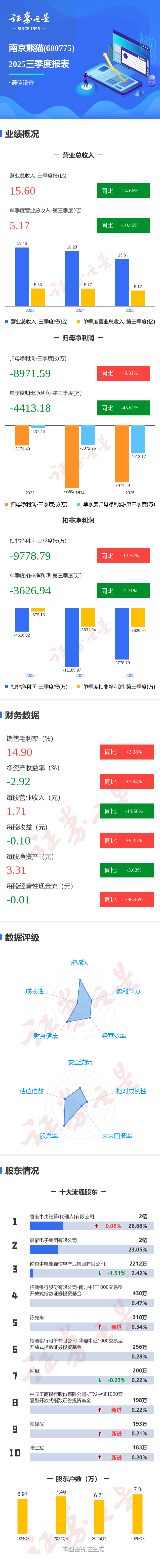 证券之星消息,南京熊猫2025年三季报显示,公司主营收入15.6亿元,同比下降14.67%;归母净利润-8971.59万元,同比上升9.31%;扣非净利润-9778.79万元,同比上升12.58%;其中2025年第三季度,公司单季度主营收入5.17亿元,同比下降10.46%;单季度归母净利润-4413.18万元,同比下降43.61%;单季度扣非净利润-3626.94万元,同比下降2.72%;负债率34.88%,投资收益8775.56万元,财务费用-514.53万元,毛利率14.9%。