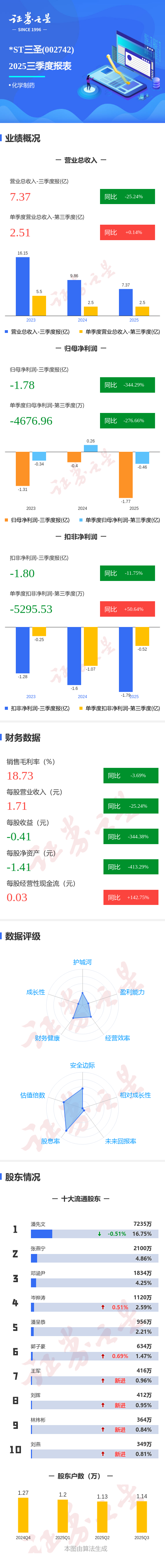 证券之星消息,*ST三圣2025年三季报显示,公司主营收入7.37亿元,同比下降25.24%;归母净利润-1.78亿元,同比下降344.3%;扣非净利润-1.8亿元,同比下降11.75%;其中2025年第三季度,公司单季度主营收入2.51亿元,同比上升0.14%;单季度归母净利润-4676.96万元,同比下降276.67%;单季度扣非净利润-5295.53万元,同比上升50.64%;负债率120.54%,投资收益-3.01万元,财务费用1.34亿元,毛利率18.73%。